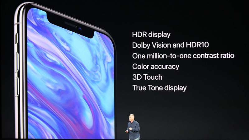 "Đây là bước tiến lớn nhất kể từ iPhone thế hệ đầu tiên" - Phil Schiller đã thốt lên như thế. Máy sẽ sở hữu màn hình Super Retina Display cùng độ lớn 5.8 inch, đạt mật độ điểm ảnh 458 ppi - đây là mật độ điểm ảnh cao nhất từ trước đến nay trên các dòng iPhone. Màn hình của máy được dựa trên công nghệ OLED Display, công nghệ này hỗ trợ HDR ở 2 dạng Dolby Vision và HDR10 giúp độ tương phản tốt hơn.