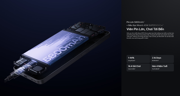 Với viên pin 5800mAh, thông thường bạn sẽ cần một thời gian khá dài để sạc đầy. Tuy nhiên, với bộ sạc nhanh 45W, việc sạc nhanh và an toàn sẽ giúp bạn tiết kiệm hàng giờ so với việc sử dụng các bộ sạc thông thường. Đặc biệt, khi bạn có ít thời gian, việc sạc nhanh 50% trong khoảng 20 phút sẽ giúp bạn dễ dàng quay lại sử dụng điện thoại trong các tình huống khẩn cấp.