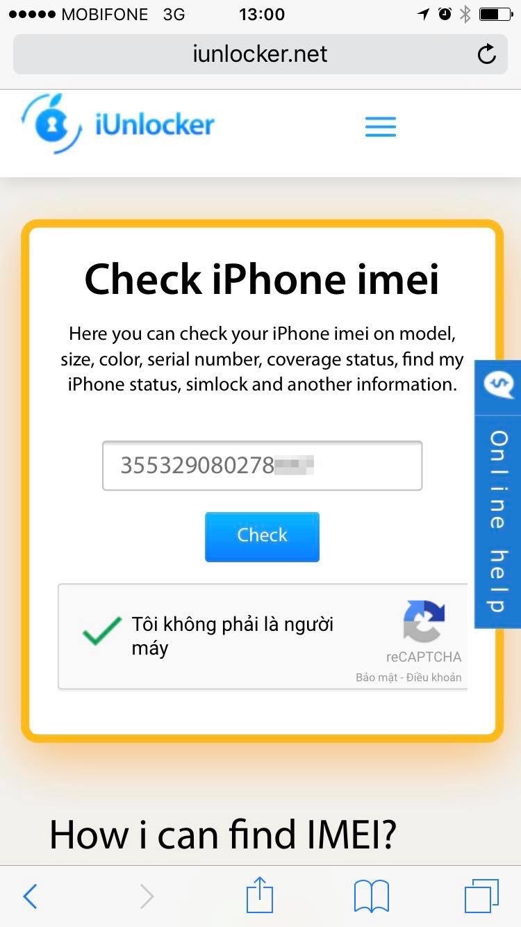 Sau khi đã có IMEI, các bạn truy cập vào trang web: http://iunlocker.net/. Sau đó, nhập số IMEI của bạn vào khung Write IMEI như hình rồi bấm Check.