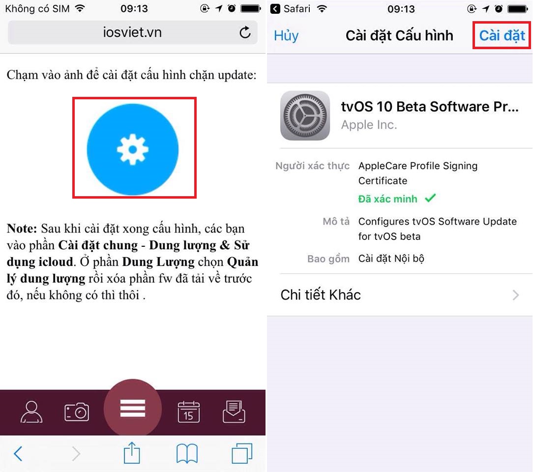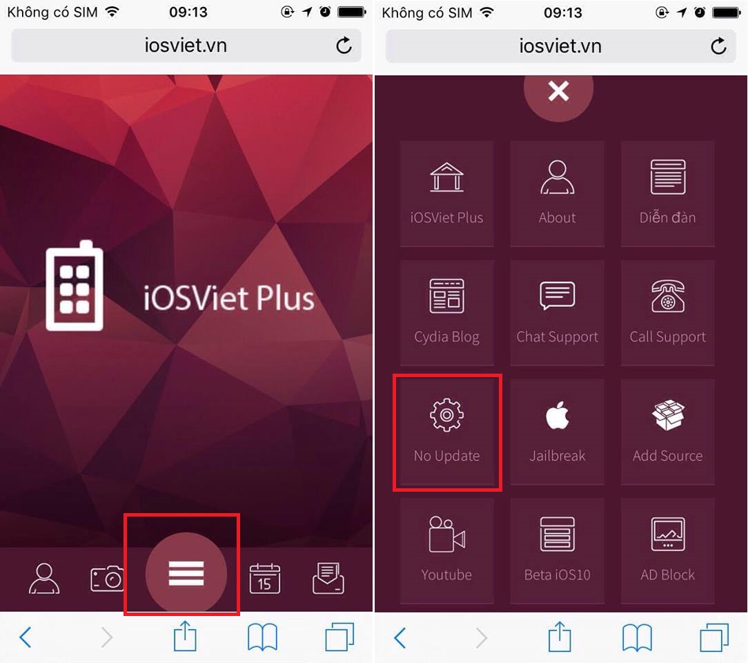Đầu tiên, các bạn cần tải về cấu hình để chặn cập nhật ios bằng cách mở Safari và truy cập vào link sau: http://iosviet.vn/plus/ và nhấp vào biểu tượng 3 gạch như hình và chọn No Update.