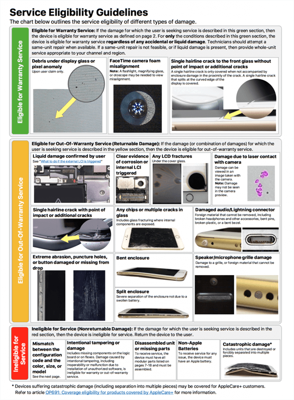 Cụ thể hơn, những hình ảnh chụp lại từ tài liệu cung cấp những chỉ dẫn về cách xác định những chiếc iPhone có đủ điều kiện bảo hành hay không.