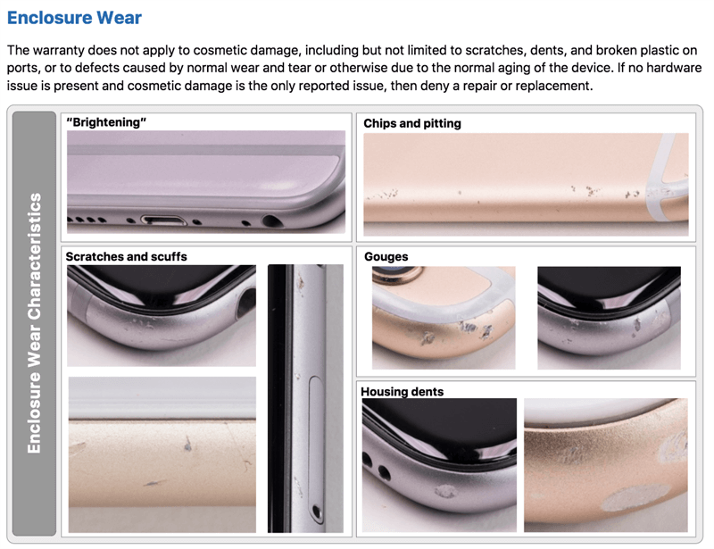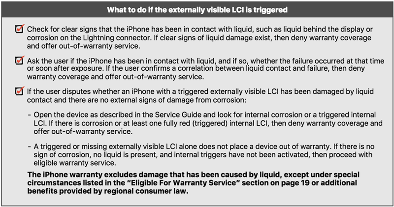 Một kỹ thuật viên của Apple cho biết: "Chúng tôi có một bản để sử dụng cho tất cả sản phẩm. VMI được dùng cho việc kiểm tra vật lý và làm thế nào để xác định chi phí cho mức độ hư hỏng. Đó chỉ là một nửa các điều cơ bản trong khi đào tạo về công nghệ iPhone."