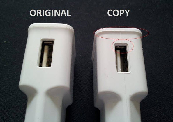 Khi bạn nhìn vào khe cắm USB thì thấy các máng được thiết kế bằng đồng, còn hàng giả được làm từ kim loại có màu bạc