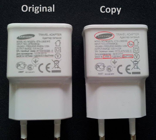 Logo Samsung và nhiều kí hiệu lạ ở hàng giả. Hàng chính hãng có ghi MADE IN VIETNAM