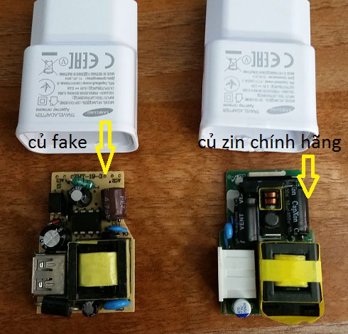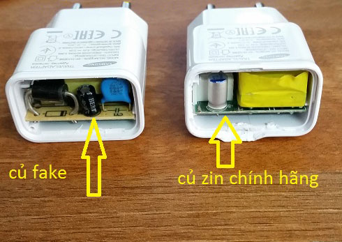Cạy nắp củ sạc sẽ thấy linh kiện và main của củ sạc chính hãng và củ sạc fake khác nhau.