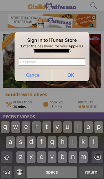 Hộp thoại đòi mật khẩu Apple ID bất ngờ xuất hiện khi Lorenzo sử dụng ứng dụng Giallo Zafferano.