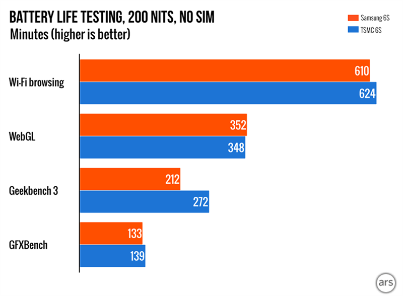 Một ví dụ khác là trên iPhone 6s, cũng có hai công ty cùng sản xuất chip cho 6s đó là TSMC và Samsung. Thời lượng pin của hai máy này chênh nhau khoảng 2-3% (TSMC dùng được lâu hơn).