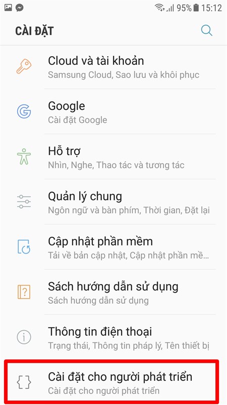 Sau đó, các bạn quay trở lại menu Cài đặt chính sẽ thấy xuất hiện mục Cài đặt cho nhà phát triển (như ảnh minh họa bên dưới).
