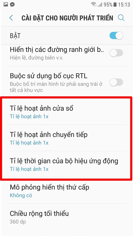 Tiếp theo, trong mục Cài đặt cho nhà phát triển, bạn cuộn trang xuống tìm 3 mục: Tỉ lệ hoạt ảnh cửa sổ, Tỉ lệ hoạt ảnh chuyển tiếp, Tỉ lệ thời gian của bộ hiệu ứng động. Ở 3 mục này đều đã được thiết lập mặc định với Tỉ lệ hoạt ảnh là 1.x, các bạn hãy chạm vào từng mục rồi chọn 0.5x.