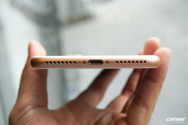 Cạnh dưới của máy gồm cổng Lightning, loa ngoài và mic thoại. iPhone 8 Plus không có jack cắm tai nghe