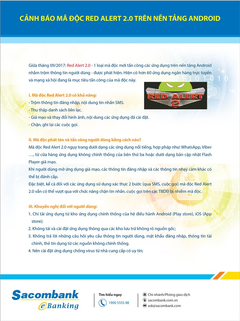 Cảnh báo mã độc Red Alert 2.0 từ ngân hàng Sacombank.