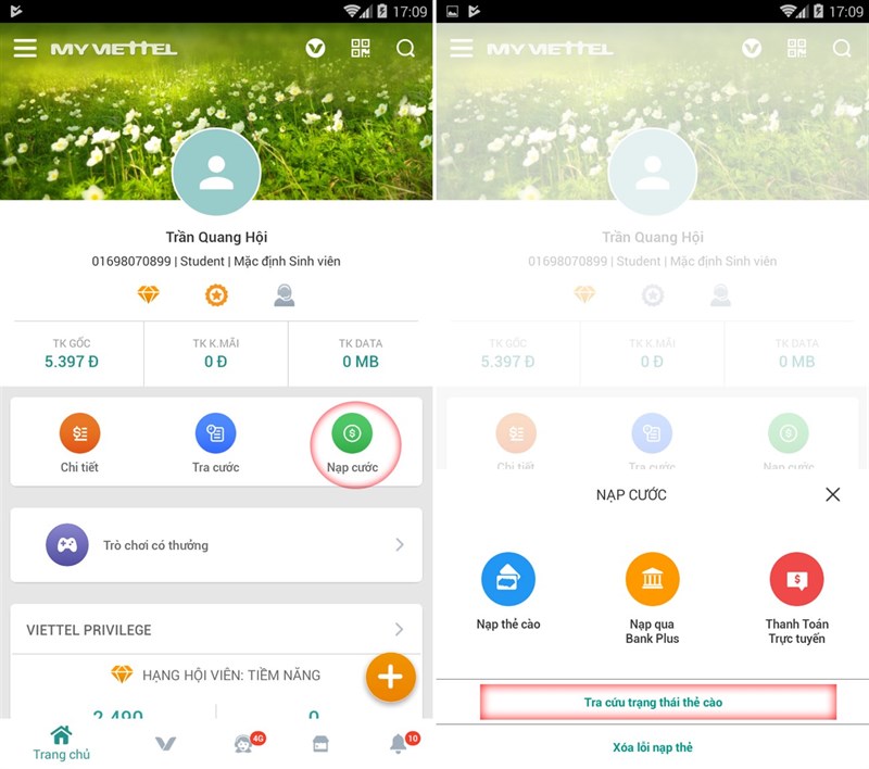 Bước 2: Tại giao diện chính của ứng dụng chọn vào mục Nạp cước > Tra cứu tình trạng thẻ cào > Sau đó nhập vào số serial được in trên mặt thẻ để tra cứu.