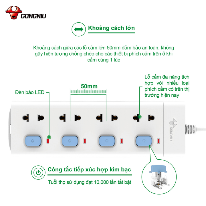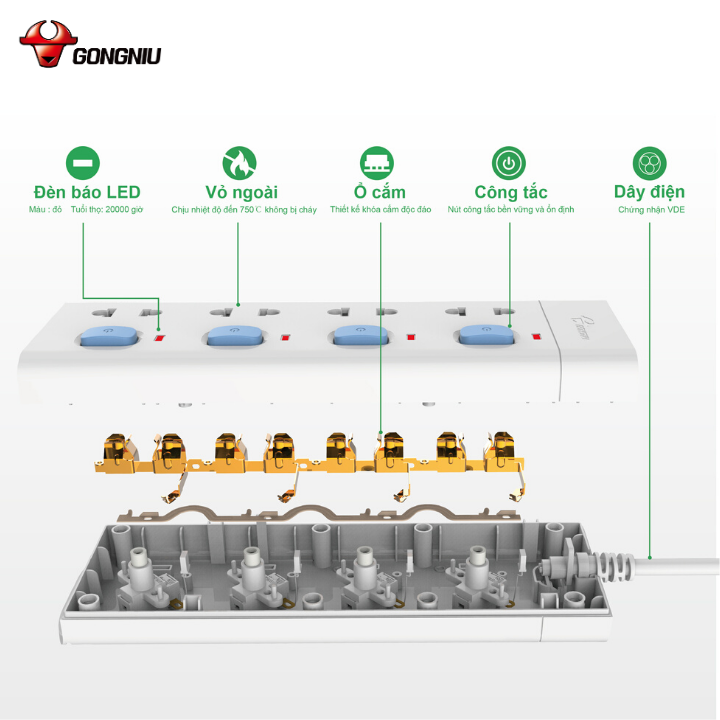 - Ổ cắm Gongniu sử dụng nhựa PP chất lượng cao, chịu nhiệt lên đến 750 độ C
