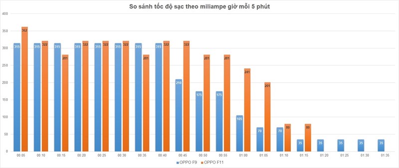Từ bảng số liệu nêu trên, trong hầu hết các khoảng thời gian, sạc VOOC 3.0 trên OPPO F11 sạc được lượng pin nhiều hơn so với sạc VOOC 2.0 trên OPPO F9. Tính ra trung bình mỗi phút, VOOC 3.0 có thể sạc được 55 mAh, trong khi VOOC 2.0 thì sạc được 38 mAh.