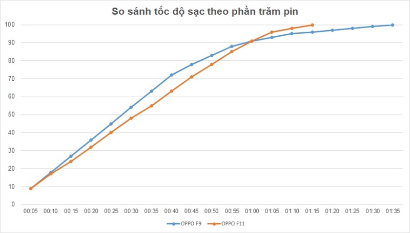 Nhìn vào biểu đồ, chúng ta thấy OPPO F9 có tốc độ sạc nhanh hơn so với OPPO F11. Nhưng kể từ mốc 90% trở đi, tốc độ sạc của F9 đã chậm đi rất nhiều. Trong khi đó thì tốc độ sạc của F11 tăng khá đều đặn và chỉ giảm nhẹ khi vượt qua mốc 95% mà thôi.