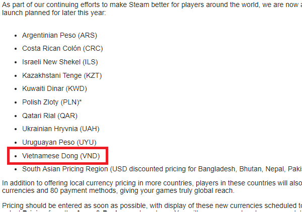 "Là một phần trong nỗ lực giúp người chơi trên toàn thế giới có thể tiếp cận tốt hơn với Steam, chúng tôi hiện chấp nhận thanh toán bằng 10 đơn vị tiền tệ và 1 region mới. Vui lòng nhập giá cho các loại tiền tệ mới để hình thức này được thực hiện vào cuối năm nay: