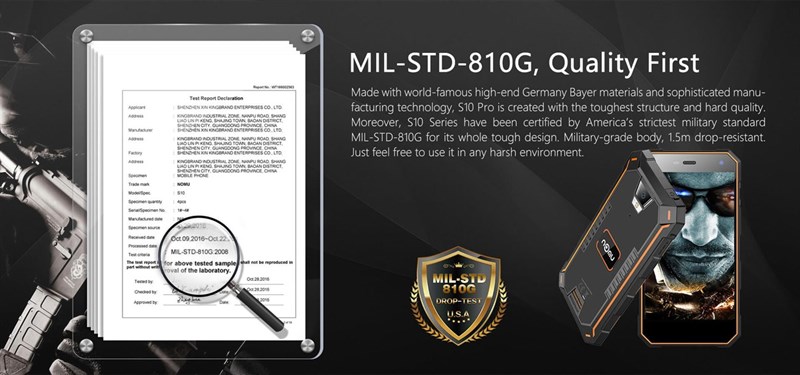 Mới ra mắt gần đây, Nomu S10 Pro nổi bật với tiêu chuẩn chống bụi, nước IP69 mới nhất với khả năng hoạt động dưới nước ở độ sâu 2 mét trong 1 tiếng. Có thiết kế hầm hố và được gia công bằng kim loại và vỏ cao su nhằm hạn chế vào nước.